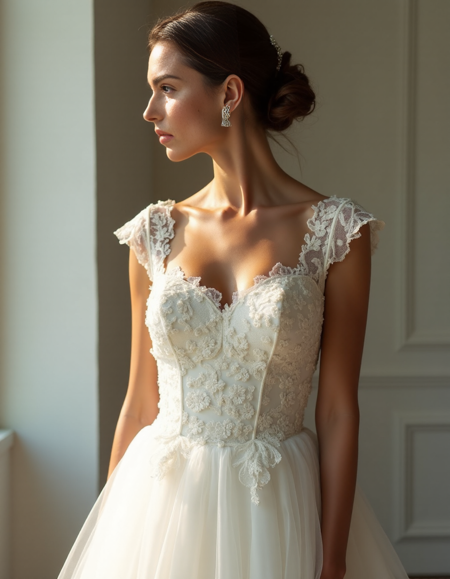 Cap sleeves work beautifully with lace, illusion fabric, or embroidery, and they’re often chosen to complement vintage-inspired gowns or dresses with delicate bodices.