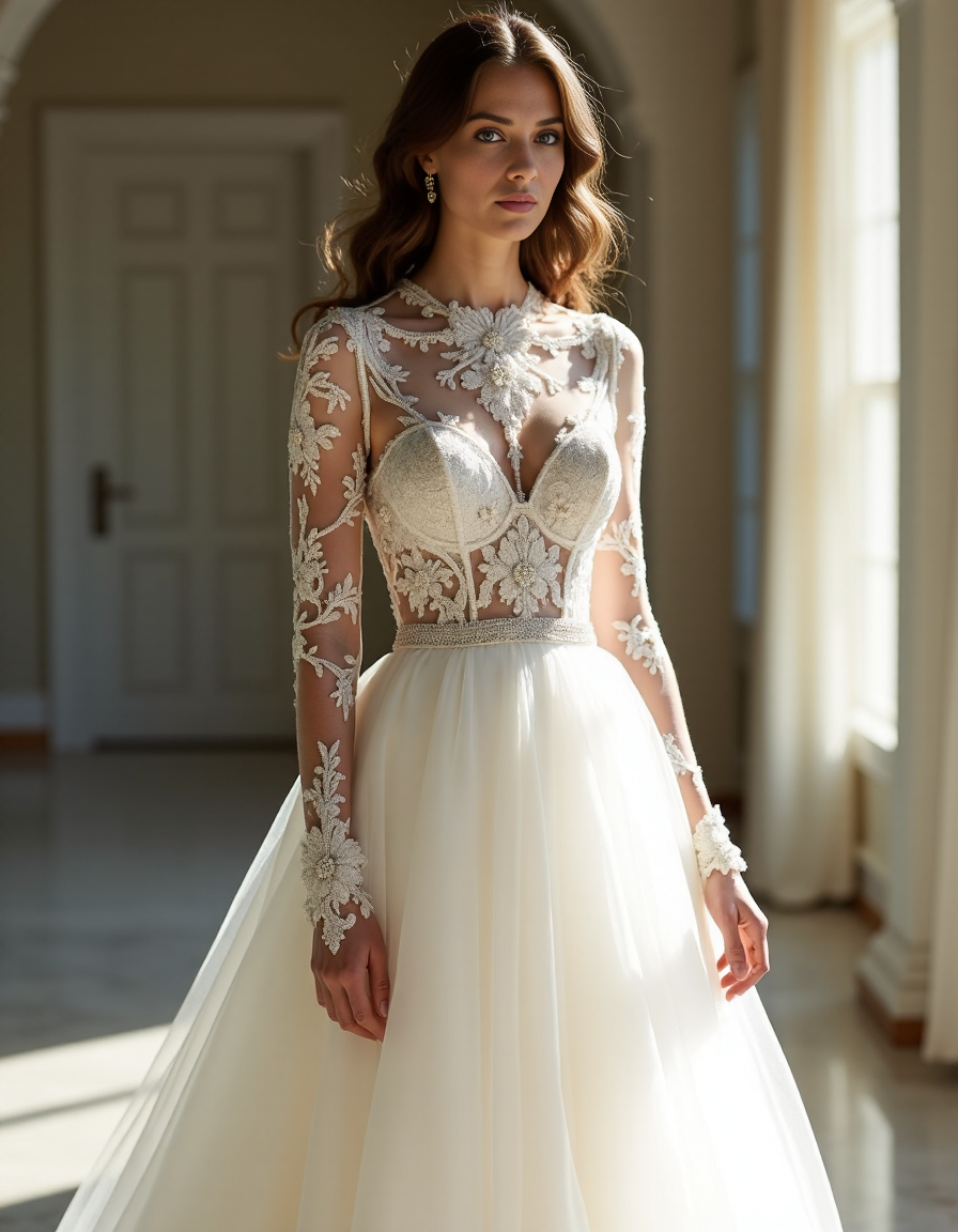 Full-length sleeves in lace, tulle, or illusion fabric offer coverage while still maintaining a soft, romantic aesthetic.