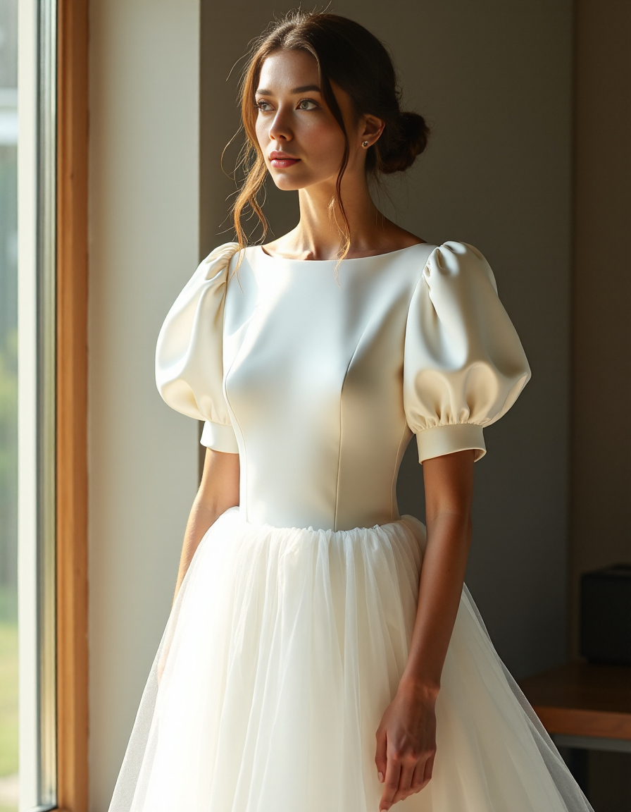 Short sleeves can be fitted or slightly puffed, depending on the desired effect.