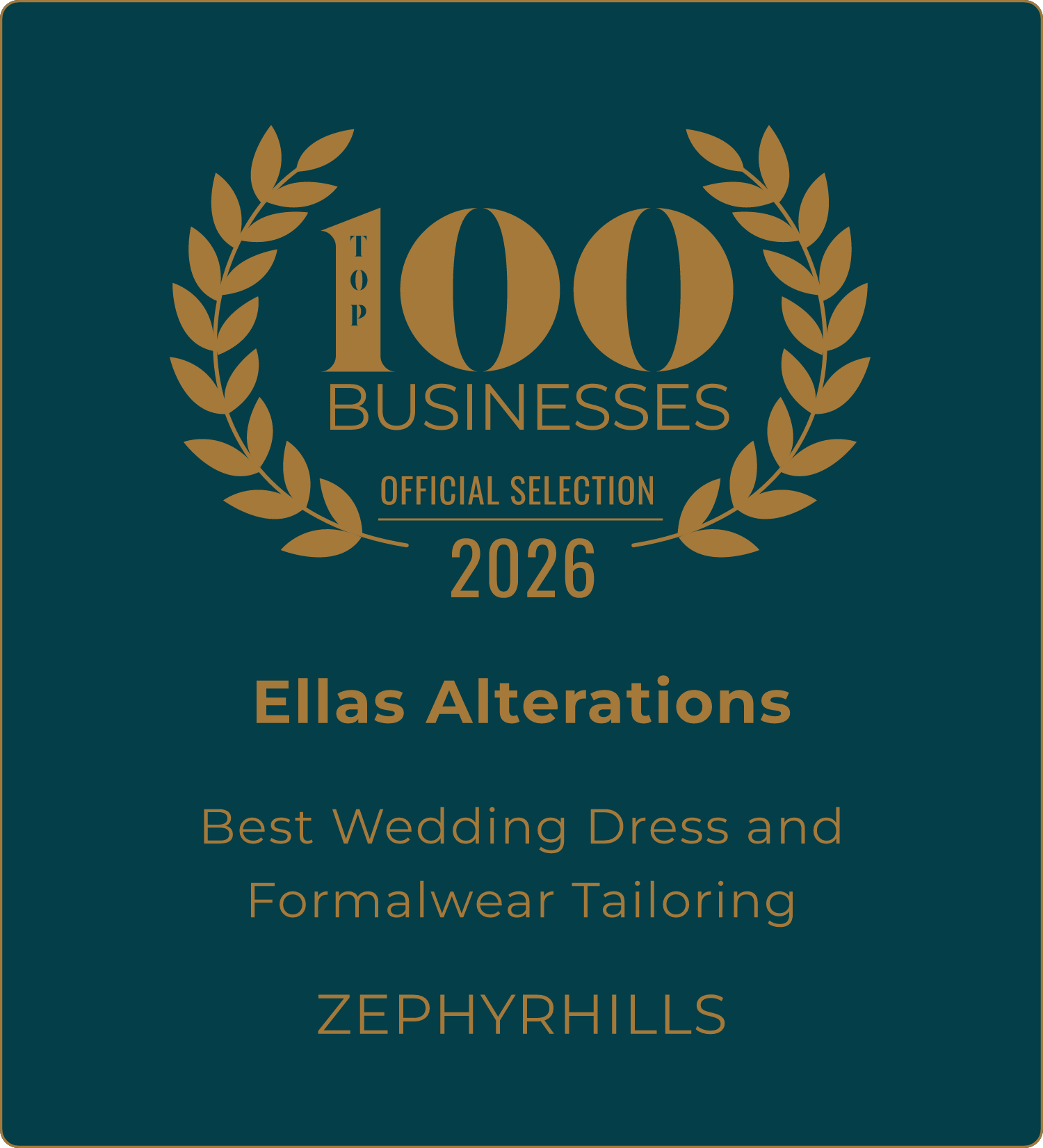 Big news: Ella’s Alterations has been recognized by Top 100 Specialty Services Awards as Best Wedding Dress and Formalwear Tailoring, Zephyrhills 2026.