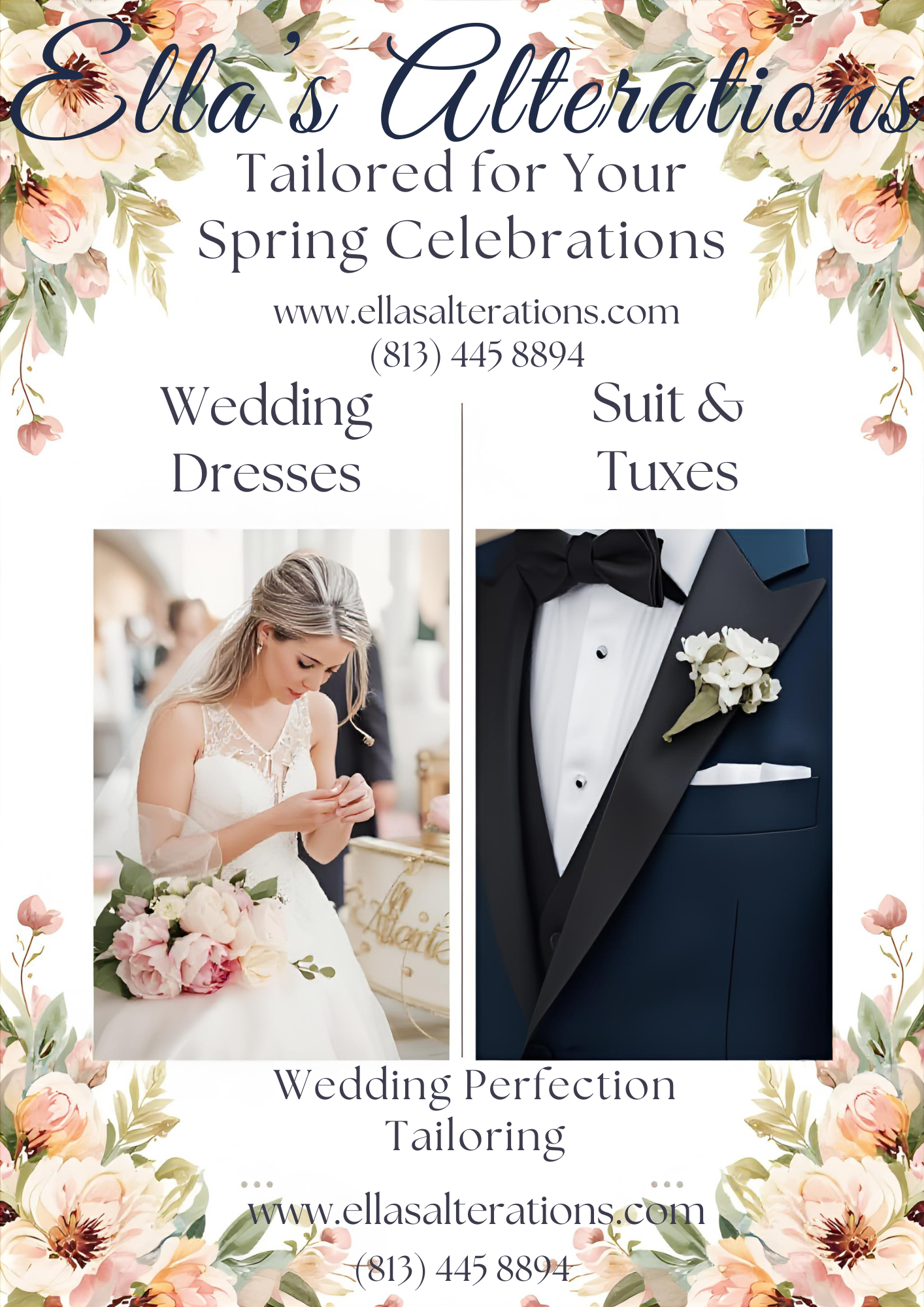 Listen: Spring formal wear should feel comfortable, confident, and completely you. At Ella’s Alterations, we tailor wedding dresses, bridesmaid dresses, suits, tuxes, and special occasion outfits so you can move naturally and enjoy your event without the stress of pulling, slipping, or constant fixing. (Audio Guide)