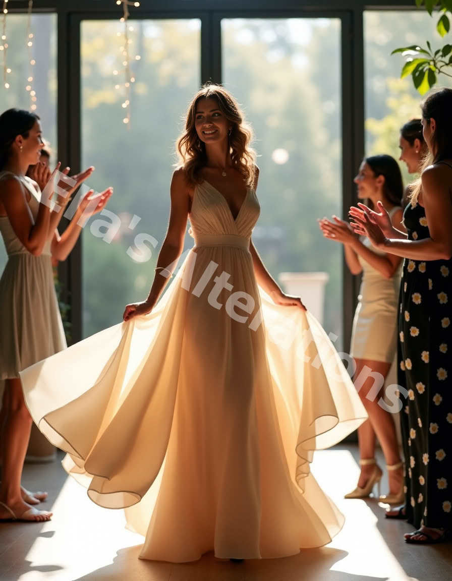 “I wanted more drama. Ella inserted mikado godets that matched my original fabric exactly. The flare looked runway-worthy, and the bustle held through a three-hour salsa set!” – Camila P., Tampa